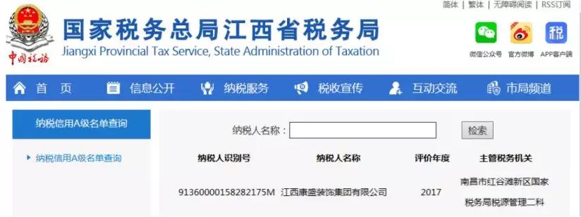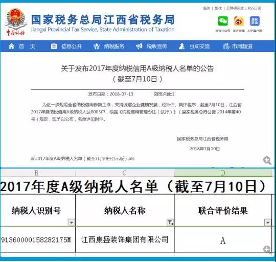 近期,从江西省国家税务局官网传来喜讯,江西康盛装饰集团再次被江西省国家税务局、地方税务局联合评定为“2017年度纳税信用A级”。