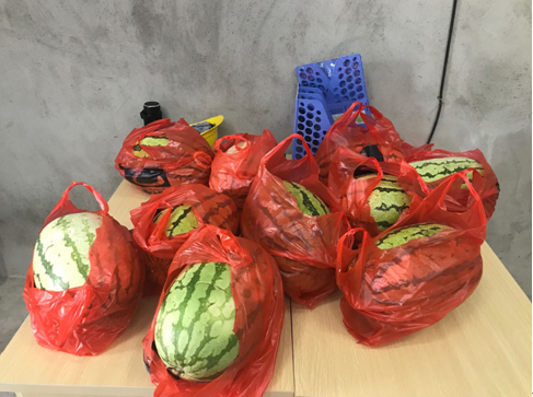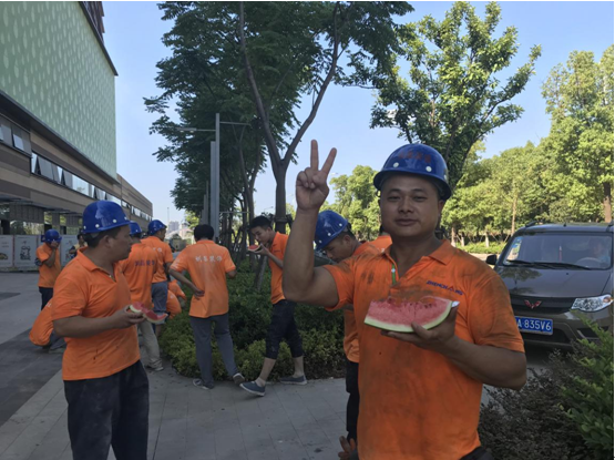 “这西瓜真甜”,工人边吃着西瓜边笑着说。工人们吃着清凉的西瓜,甜在嘴里,暖在心里。