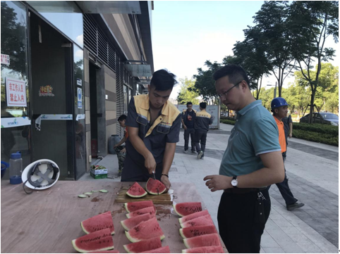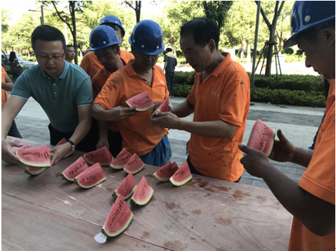 7月20日,圳昌集团行政部代表公司给红谷滩“永不落幕”VR项目工地的工人们送上防暑药品和西瓜。