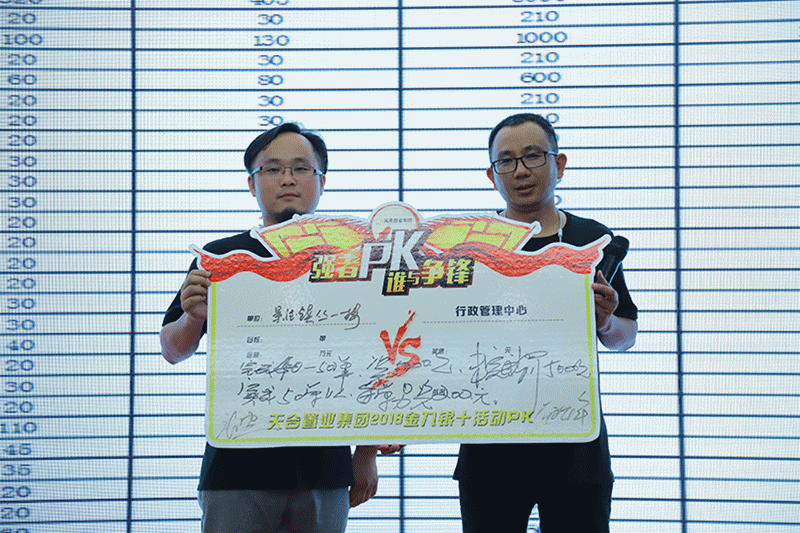 29家家装单位执行总经理纷纷上台签署了金九银十活动军令状,并集体宣誓,对完成确保任务信心满满;在金九银十活动PK环节,南昌丛一楼、南昌英泰、赣州丛一楼、吉安丛一楼、吉安英泰、景德镇丛一楼、西昌丛一楼、大理丛一楼、泰和丛一楼、吉安县丛一楼等10家公司与天合置业集团进行现场PK,PK完成力争任务。