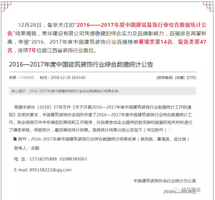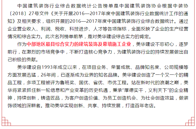 中国建筑装饰行业百强公布,美华建设连续多年江西第一