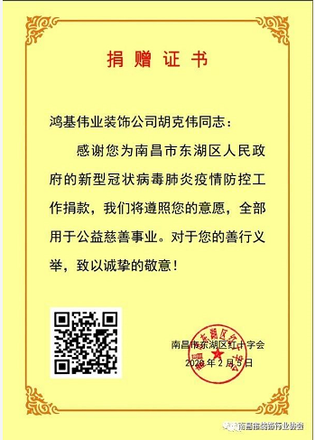 2月05日,南昌市鸿基伟业装饰工程有限公司积极响应,通过南昌市东湖区红十字会,为抗击新型冠状病毒肺炎疫情捐款,此次捐款将由南昌市东湖区政府实施救助工作,用于支持疫情抗击工作!