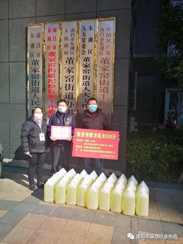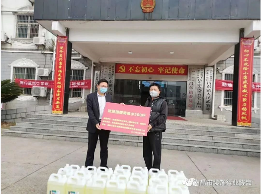 2月24日,胡克伟先生又一次来到家乡高新区昌东镇,通过南昌高新区昌东镇人民政府捐赠500斤消毒水,用于高新区昌东镇新型冠状病毒肺炎疫情防控工作。