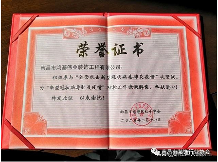 协会会员企业南昌市鸿基伟业装饰工程有限公司积极为抗击肺炎疫情多次捐款捐物