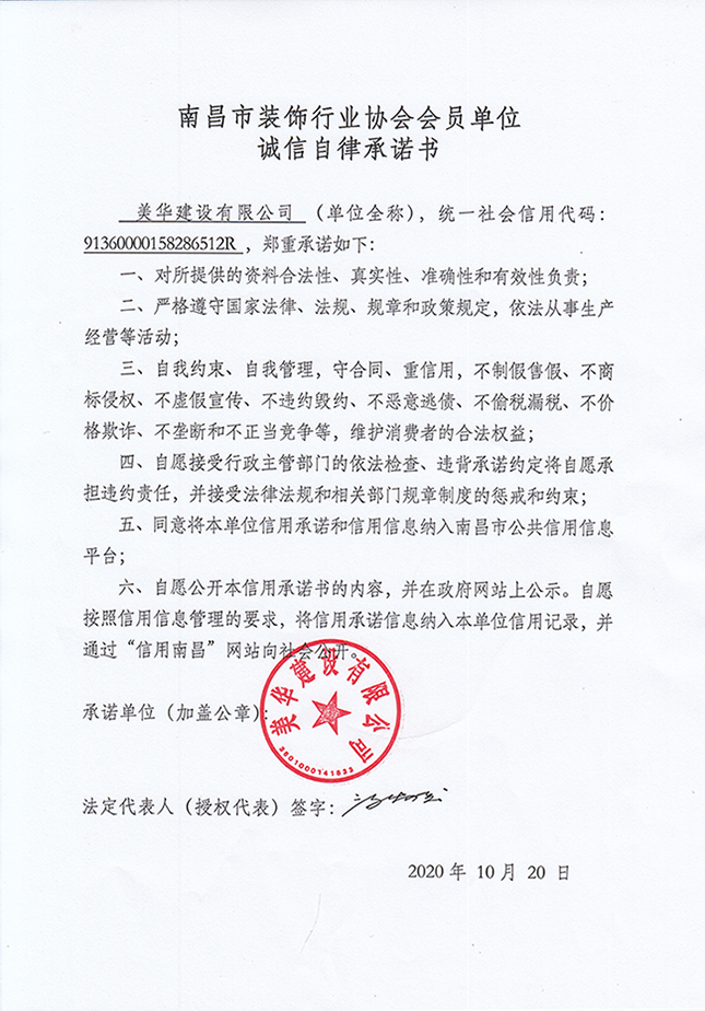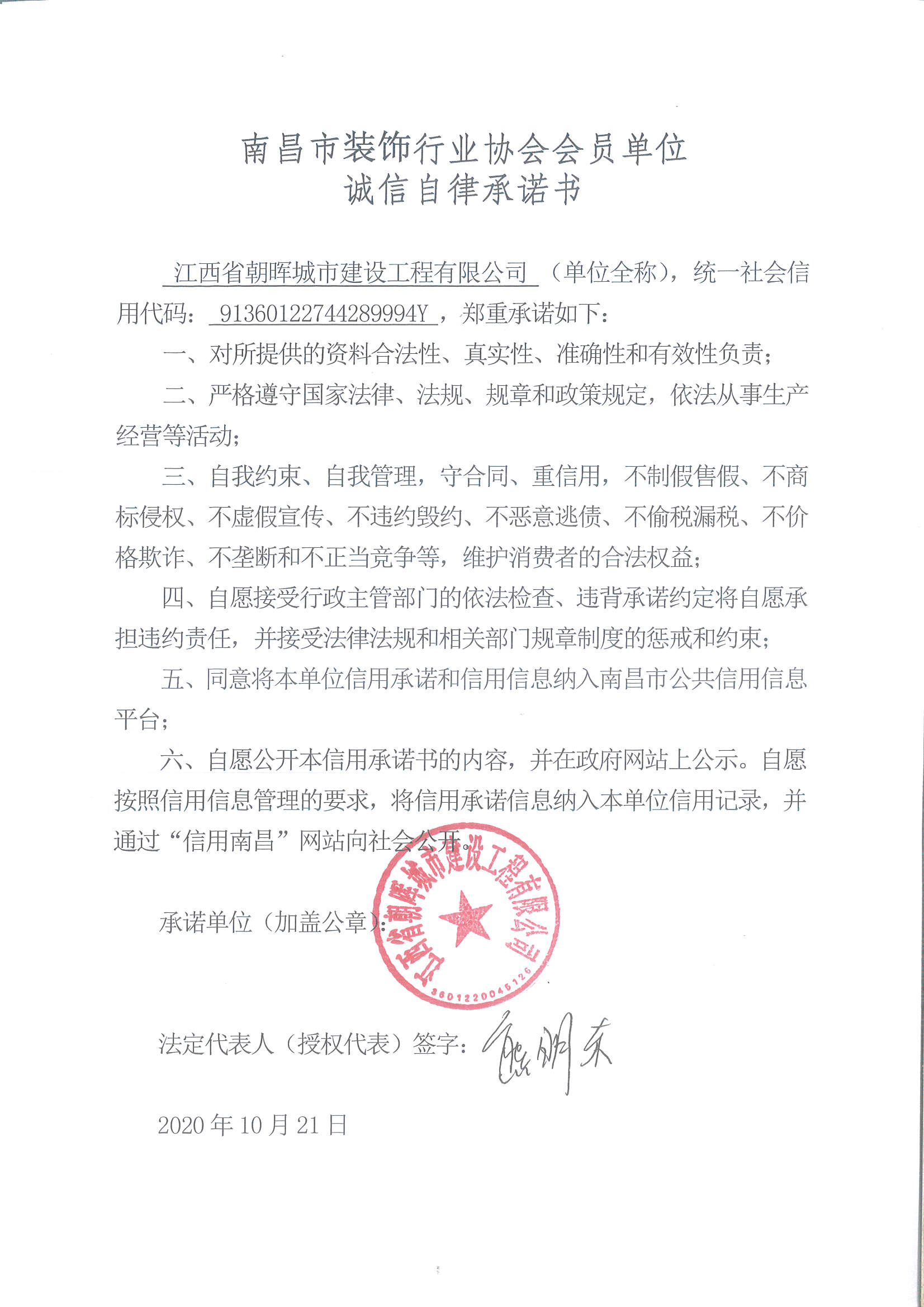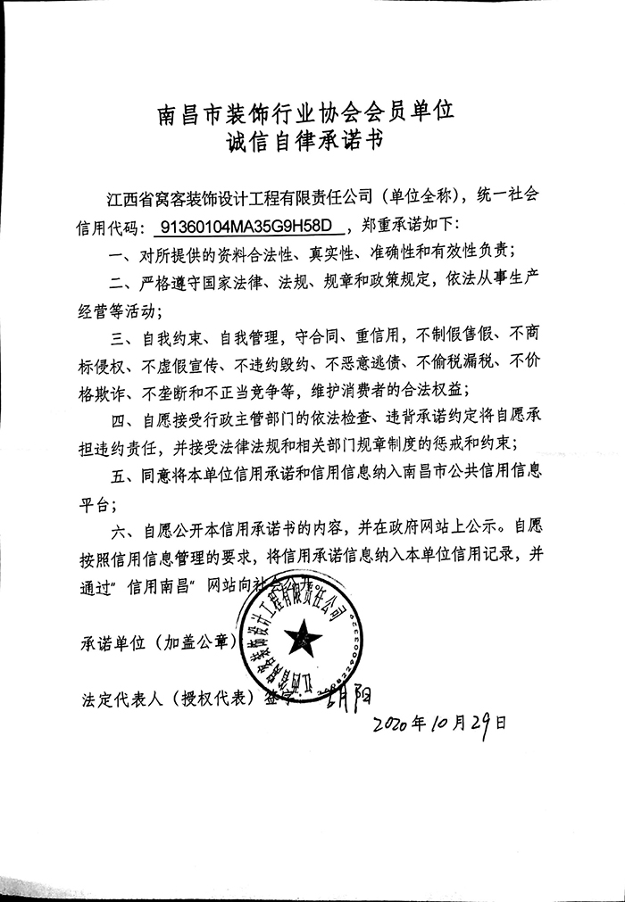 南昌市装饰行业协会会员单位诚信自律承诺书
