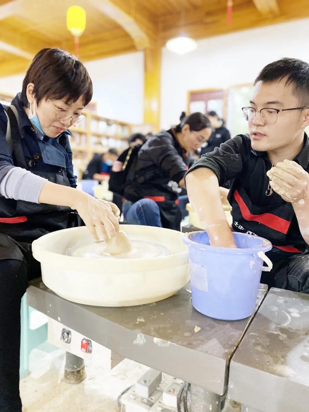 领略了大师的风采,小伙伴们迫不及待的开始了拉坯DIY,亲自动手、施展“制陶”才能,在陶艺体验中领会手工制作的乐趣,大家在热(相)闹(互)温(取)馨(笑)的氛围中增进了同事感情,体会陶瓷手工艺人的巧夺天工。
